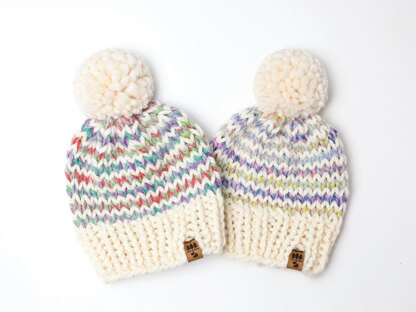 Our adorable pinstripe pompom hat is the perfect gift for your loved ones, young and old. Available in the following sizes: Newborn, 0-3 Months, 3-6 Months, 6-12 Months, 1-3 Years, 4-12 Years and Women. The hat is made with Lion Brand Wool Ease Thick & Quick yarn.