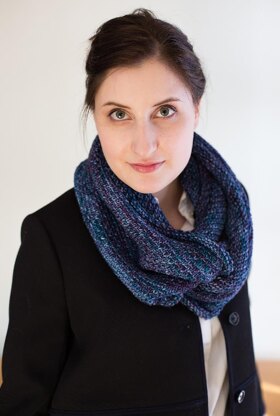 The finished cowl is roughly 60" in a loop and wraps twice or three times. It is knit in colorway Baltic Ocean, from Zen Yarn Garden.
