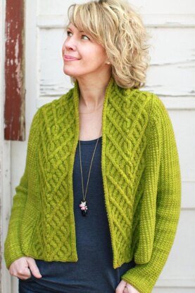 Verdea is a cropped, a-line swing cardigan with raglan sleeves. The body and sleeves are textured as a nice compliment to the boldly cabled collar that is knit separately and seamed onto one front, around the back neck, and down the other front.