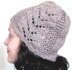 The hat features ribbed edging and a leafy lace panel over a garter stitch background. The rest of the hat is knit in easy stockinette stitch. The edge can either be worn down for a slouchy look or rolled up for a shorter beanie look.