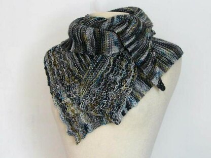 This is a bias-knit garter shawl with an openwork lace edging. Gauge is not a particular requirement for this pattern, and it can be knit equally well in worsted or DK weight yarns.