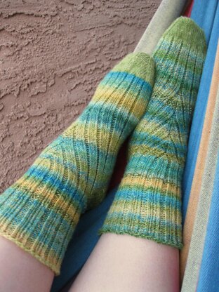 Please also note that the white variegated sock was a sample and the wrapped stitches shown are not included in the pattern. The pattern creates a sock with V increases in ribbing at the instep.