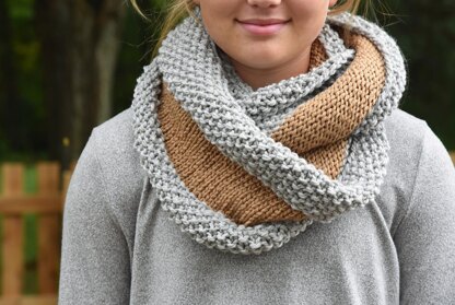 This cozy piece can be knit using two colors or one solid color. The cowl is designed to hang straight down or loop around the neck, and measures 25" wide (laying flat) by 12" tall.