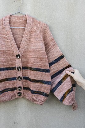 The Verona cardigan is a hip-length style knit with a V-neck and long balloon sleeves. Cardigan body and sleeves are worked in different colour solid stripes. This sweater is worked top-down in Stockinette stitch pattern in raglan using increases M1L and M1R. The front edge is worked in double knit only after knitting the whole sweater. Neck, cuffs and hem are worked in Rib stitch pattern. The body and sleeves of the sweater are worked straight, therefore they can be easily made longer - so more yarns should be estimated. Verona cardigan is a timeless knit that will fit well with your favourite clothes.
