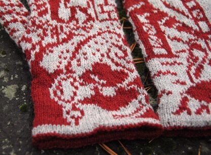 The pattern comes in three sizes: 66, 70, or 74 sts. Right and left mittens are worked from separate colorwork charts. The pattern contains long floats; using the Ladderback Jacquard technique is recommended but not essential.