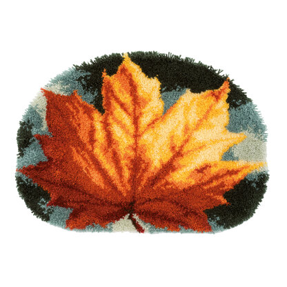 Approximate finished size: 70 x 50cm. Shaped latch hook rug with latch hook and binding tape for finishing. Vervaco Autumn Leaf Shaped Latch Hook Rug Kit includes hand painted large hole mono canvas: 52 % cotton/48 % polyester, yarn: 100 % acrylic (cut packs), instructions and front sheet picture.