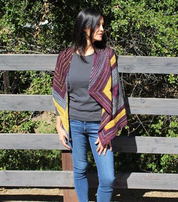 Very Vixen is a 3 color shawl/wrap. This is knit in the round, and then flat with 3 colors or a mix of scraps.