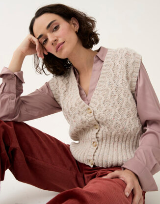 With travelling cables, moss stitch and a deep, ribbed hem, this versatile retro-inspired vest knitting pattern is brought up-to-date with a modern silhouette. The tweedy neps of Sirdar Loveful 100% Recycled Tweed Blend, will add even more interest to the textured stitches of this knitting pattern.