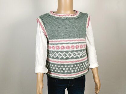 A girl’s vest with beautiful colors that is partly knitted with the Fair Isle technique.