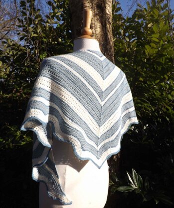 Vester Hornum is a triangular shawl worked as a Danish tie shawl that can be worked in one single or three different colors. The whole shawl is knit with stripes of simple lace patterns. The larger sizes are suitable to be worn as a tie shawl. The shawl pictured is size small, the directions includes directions for three different sizes of the shawl.