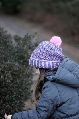 This reversible hat is loaded with texture and look great on both sides even though they look different. The graphic stripes and textured honeycomb are formed with a four-row repeat and are simple to knit because you only work with one color at a time. Complete this winter hat for your snowy adventures by adding a colorful pom pom.