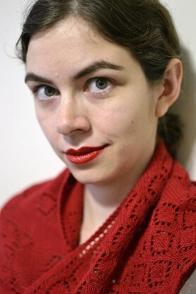 Victoria is a solid triangular scarf that gradually becomes lacier toward its edges. Knitting at a slightly tighter gauge than fingering-weight yarn is usually knitted for shawls emphasizes the lines formed by the decreases. They create sinuous curves as the lace pattern becomes denser.