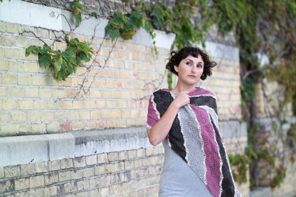 Undulating stripes in alternating colors are separated by narrow bands of eyelets, like wisps of fog in a cloudy sky. The simple shape and easily memorized lace pattern of this shawl make for relaxing knitting, and the various stripes create an opportunity to experiment with color and use up small amounts of stashed yarn.