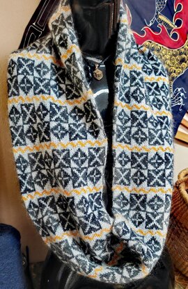 Vidlin is a small Scottish village on the Shetland Mainland, located at the head of a narrow seawater inlet. Its name comes from an Old Norse word that means a ford, or a shallow place in the inlet where one could cross. In my design, the inlet is represented by the wavy gold band placed between the repeats of the XO Fair Isle motifs. The cowl is knit in the round as a tube, and it is finished by joining the cast on and bound off edges using the mattress stitch. As only two colors are used on any round, this makes for a relatively simple, yet interesting project.