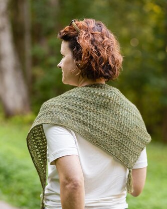 Vielo Shawl features easy lace stitch pattern. The pattern flows in a repeatable way, so it can be easily memorized. The shawl is knitted from side to side. Lovely shawl knits up quickly with one 50 g skein of light fingering weight yarn.