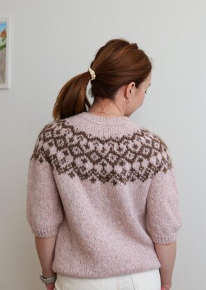 This soft and elegant lopapeysa sweater is worked seamlessly from the top down. You’ll start with a comfortable ribbed neckline, then add short rows at the back to gently shape it. The colorwork yoke is worked next, creating the classic Icelandic-style design. After that, the stitches are divided for the body and sleeves. The body is knitted in the round down to the hem and finished with soft ribbing, while each sleeve is worked in the round from the top down to the cuff.