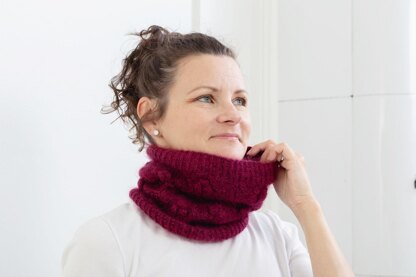 This little and lovely cowl features lace stitch pattern with bobbles. The cowl is knitted in the round. The size can be easily modified either wider or longer.