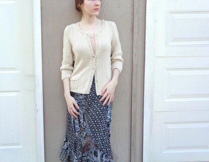 Vinca is a basic chic cardigan for warmer weather in a light cotton knit. Lacy pockets add a pretty touch.