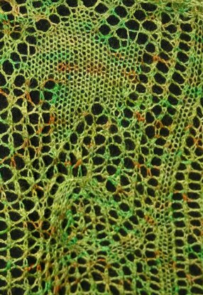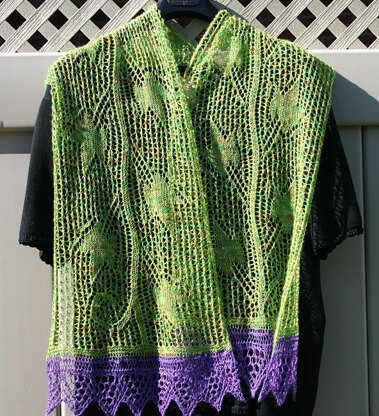 This lacy shawl is inspired by grapevines & grapes. A vine wanders the length of the shawl, with leaves on alternating sides and a little curlicue at the start and end. The border is full of bunches of grapes.