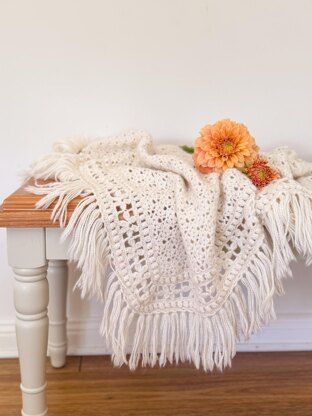 Lacy Vintage Style Blanket Pattern with flower detail border, and tassel options, suitable for baby blanket or throw.