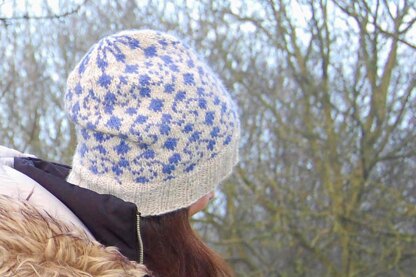 DK stranded hat with a custom-designed motif that makes the the eye move in pleasing fashion, reminiscent of old china patterns. There is also a pretty spoked motif on the crown.