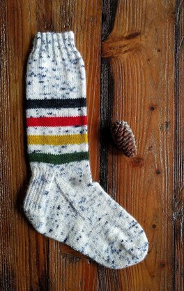 This is a tried-and-true sock design with vintage inspired bands of colors and understated blue speckling for a modern twist. The stripes are lower down on the sock, so they can more easily make an appearance when wearing pants. Perfect for those who love being out on a mountain trail, and clearly very Hudson Bay.