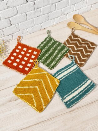 - Material: Knitting needles 4 mm and 3.5 mm Crochet hook 3.5 mm 30 gr Cotton Aran yarn in 2 Colors for each potholder
