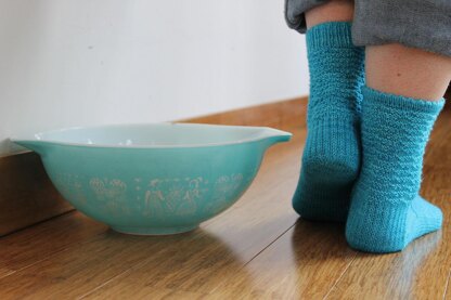 These socks, with wee Pyrex bowls stacked on top of each other, is a part of a kit being offered by the amazingly talented and Pyrex-obsessed Knitted Wit. You can purchase the pattern on its own, OR you can head over to LJ's shop and snag pattern, yarn AND project bag with stitch markers and sticker. There are two yarn options: Butterprint and Pink Gooseberry. Two of the most popular Vintage Pyrex patterns.