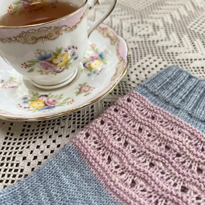These socks are a pretty way to use a Mandi’s Makings Share A Pair set or two 50 gram skeins! The patterning has a vintage china feel and is a simple feather and fan variation that has only one lace round out of the eight round repeat!