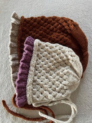 A cute bonnet with ruffle and lace pattern.