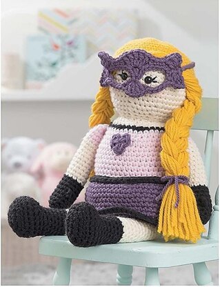 Save the day with this huggable superhero. Basic stitches and soft yarn make for a great gift for any child. Violet is soft amigurumi doll with long braided hair, superhero goggles and a two-piece super suit. Includes step-by-step instructions, diagrams, and detailed full-color photos. Pattern calls for US size 6 super bulky weight yarn and a size J-10, 6 millimeter crochet hook. Finished hero size measures approximately 15" tall. Easy skill level.