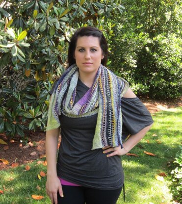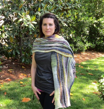 Violet Waves is a lightweight wrap for spring and summer. It softly undulates with the wonderful colors of Noro yarn. The finished wrap measures 72 inches (182.9cm) in length by 18 inches(45.7cm) in width. The top of the wrap is made with the Tunisian Simple Stitch. It is is only 15 stitches across and can be made with a conventional crochet hook instead of with a Tunisian or Afghan hook. The rest of the wrap is traditional crochet across the length. It is composed of rows of stitches that grow gradually taller and then shorter, thus creating the wave effect.