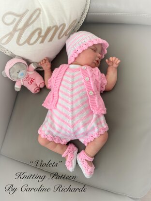 This pretty little set comprises of a cardigan, Romper, Sun hat and little shoes. The cardigan is knitted from the top down on straight needles. The Romper is knitted in two pieces and sewn down the sides. The hat and little shoes complete the set. The instructions are simple to follow and comes with line by line instructions