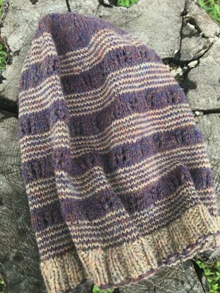 This micro-striped hat is knit in a lightweight fingering yarn with just enough lace to make it cool enough to wear late in the fall and early into the spring. It’s designed to be slouchy and worn set back on your head as a fun accessory, but it can also be pulled down low over the ears for warmth. The micro-stripe is achieved by changing colors on every row or you could experiment with a fun self-striping yarn. The easy lace pattern keeps your attention while still being simple enough to enjoy some conversation with friends or to watch your latest tv binge.