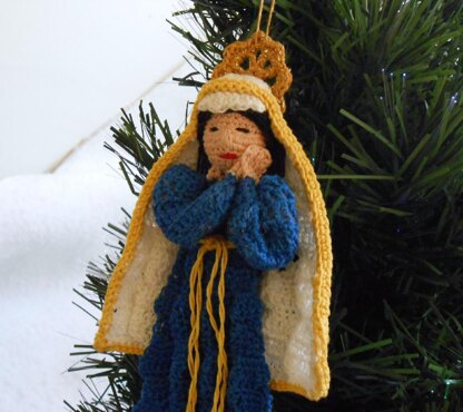 You can make this virgin Mary decoration for your tree, wreath, home decor or just as a teaching tool for young children. (There are no breakable parts for young hands to break). Mary was an excellent example of how God can use each of us if we are willing. She would look wonderful on a wall display for people who are out of shelf space. This pattern is made using U.S. crochet abbreviations and would be good for an intermediate crocheter. She has a gathered looking royal blue dress which is trimmed in golden yellow. Her gathered looking white headress is also trimmed in golden yellow. She has a gold halo on top of her headress. Materials: bedspread weight cotton threads (size 10) 11 yards peach (or choice of skin color) 60 yard dark Royal Blue (or choice of Mary’s garment color) 45 yards white (or choice of head covering color) 3 yards gold (or choice of halo color) 10 yards golden yellow (or choice of Mary’s garment contrasting color) 1 skein of black embroider