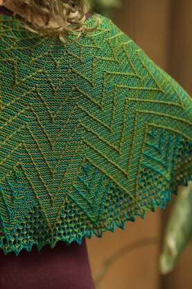 Viridine is a striped semicircular shawl overlaid with a cable motif that radiates from a central flower into a star shape.