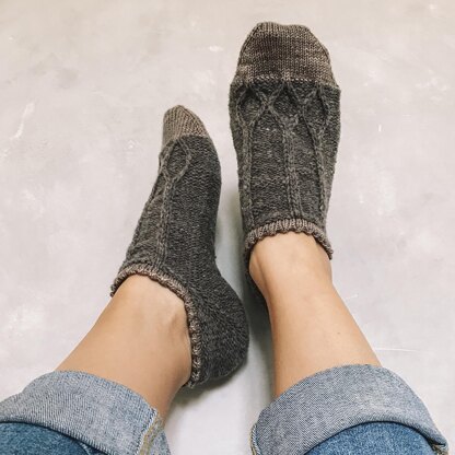 I absolutely adore these pair of socks. I am in love with ankle socks since I designed the “Stonehouse Socks” pattern and I wished for many more of them. :-) This pair is my current favourite because it is quick to knit, with beautiful cables and slip stitches and has this cute picot edge on top. The directions are for the Magic Loop method.