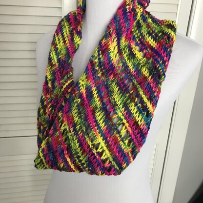 Ever tried Tunisian on the bias? This cowl is a one-skein beauty. It is a parallelogram of knit stitches with an alternating row of lace.