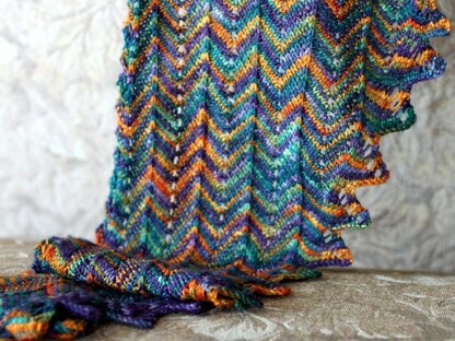 This sideways shawlette makes the most of the gorgeous highly variegated sock yarn from Dyeabolical Yarns. The chevron pattern adds interest and breaks up any pooling and the simple edgings stand out without being obscured by awesome loud colors. The shawlette is long and thin with a crescent shape achieved by shaping along the top edge. Available in written and charted formats.