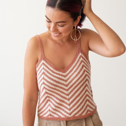 Viva summer! This design is a pure celebration of warmer weather knits. Playful striped chevron pattern, v-neck both in front and back, comfortable and adjustable straps, and simple straight silhouette make Viva an easy companion for warmer weather.
