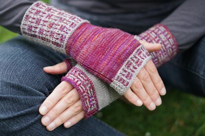 The pattern combines mosaic knitting with the intarsia technique to create a single-coloured, textured insert that runs through the basketweave. The insert continues as a ribbed stripe along the edge of the hand to provide a good fit. Colours can be reversed or kept the same for both mitts.