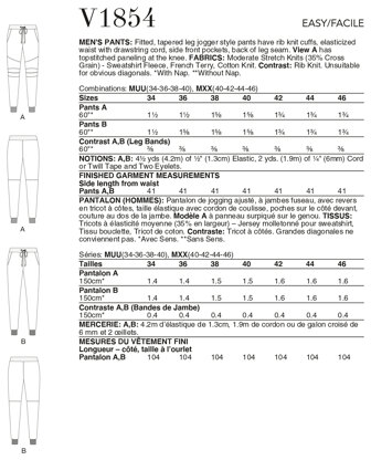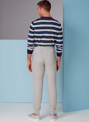 Fitted, tapered leg jogger-style pants have rib knit cuffs, elasticized waist with drawstring cord, side front pockets, back of leg seam. View A has topstiched paneling at the knee.