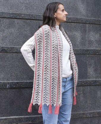 The textured lacy stitch is directional, so the work starts at the center; when half of the shawl is done, the yarn is joined to the starting chain (center) to work in the opposite direction and make the other half. After the base is finished using the main color only, the contrasting stripes are crocheted on the surface of the fabric in the grooves designated for them, adding fun color accents.