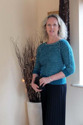 The waffle check pattern is a combination of garter stitch and slip stitch. The lighter weight yarn is used for the slip stitch rows. The raglan sleeves are joined to the Front and Back with knitted seams.