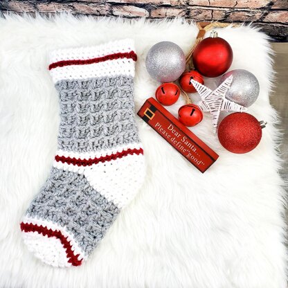 Bernat Softee Chunky Weight #6 – 100% Acrylic with 2 or 3 balls – I used 3 different colors for this Stocking – Half a ball of White, 1 full ball of Grey Heather and approx 30 grams of the Color Vino (Red).