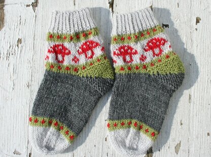 I've designed these socks for Luis, the grandson of my neighbour Heidi. The boy will go to the Waldkindergarten in September. A Waldkindergarten is a nursery in the nature, in the forest. The kids spend much time outdoor and need warm clothes. I hope, these socks will keep Luis’ feet warm. Besides the magic toadstool is a symbol for fortune.