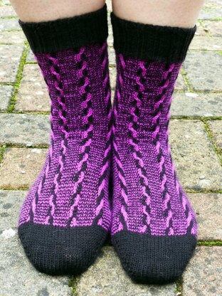 Why not take a walk on the wild side with these socks that feature both colourwork and cables? Actually, they're not so hard as they look as the multi-coloured effect is achieved using slipped stitches so that only one colour is used at a time, even while working the cables.