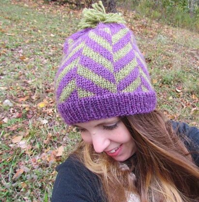 This hat was inspired by an art deco wallpaper print. The pattern is knitted using stranded color work and is worked entirely in the round. Pattern uses written instructions as well as a simple chart.