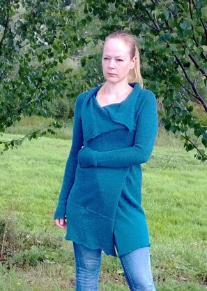 You can wrap it around you, knit a belt to it, fasten with a shawl pin, anything! No waist shaping in the pattern, the shaping comes naturally when you wear this garment!