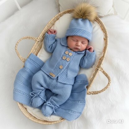 This pattern provides the instructions to make the Jacket, Shorts, Longer leg trousers, Bobble hat and Shoes. Both the jacket, shorts, and trousers are knitted from the top down using single pointed standard needles, with easy line by line instructions